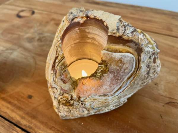 het warme kaarslicht gloeit zachtjes door de steen heen, waardoor de kleurlagen van het agaat prachtig zichtbaar worden. Het resultaat is een sfeervol, bijna betoverend effect.