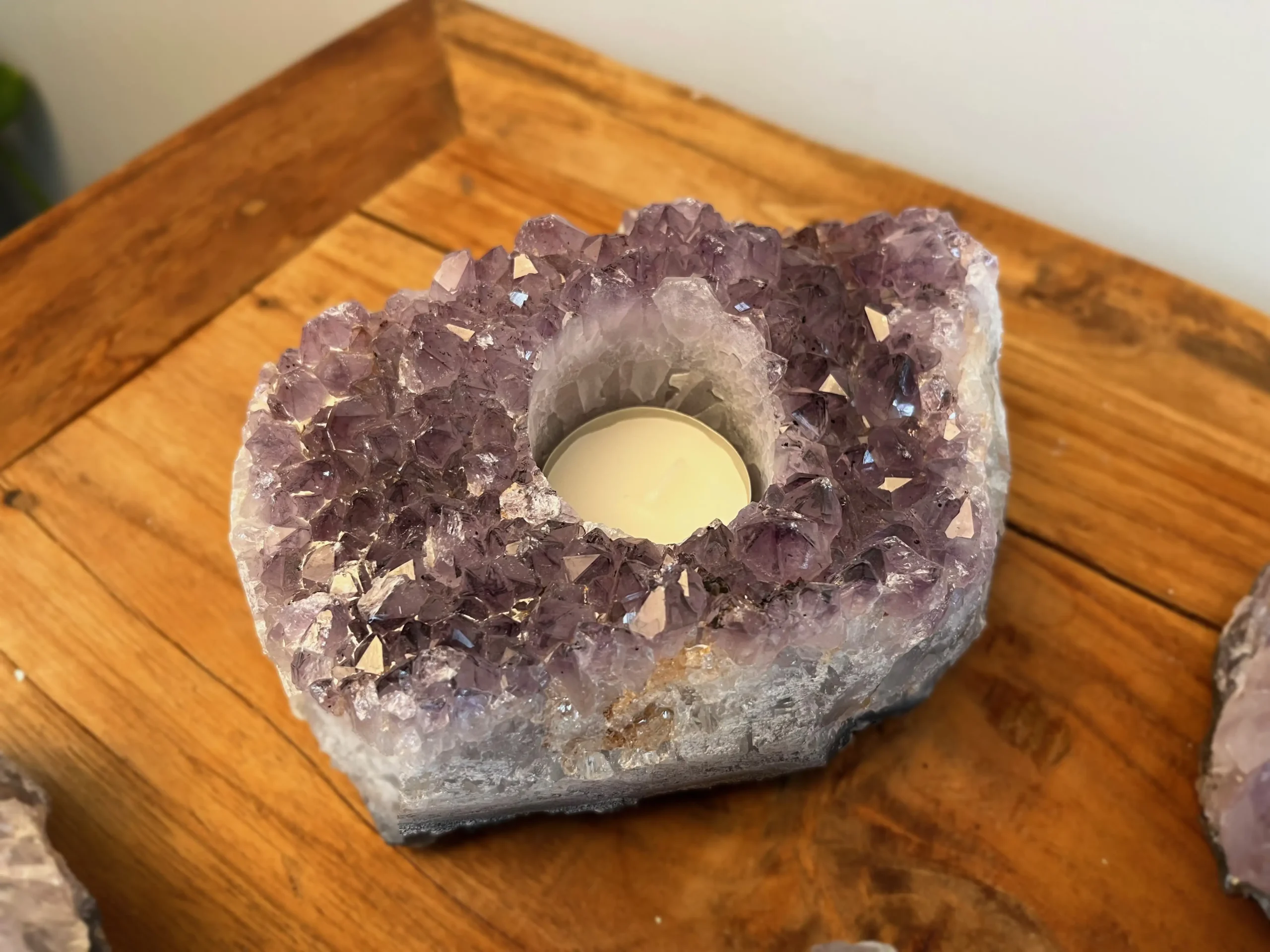 Geen twee amethist theelichten zijn hetzelfde. Elke cluster heeft zijn eigen vorm, kristalrichting en paarse schakeringen. Van licht lavendel tot diep violet.
