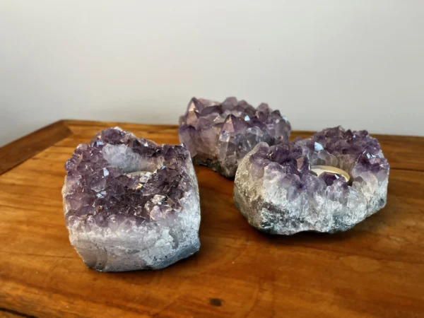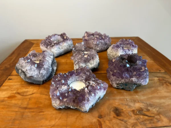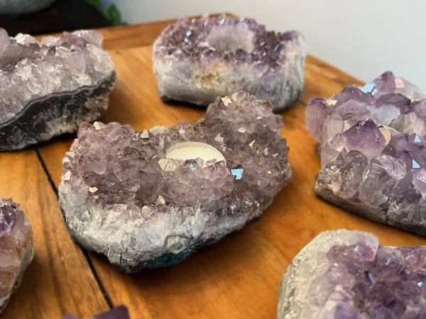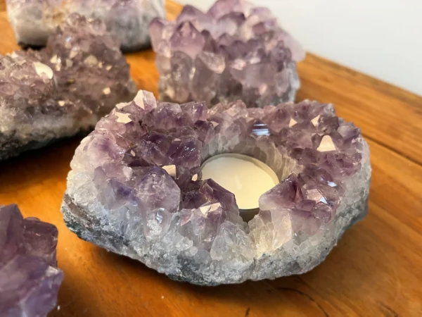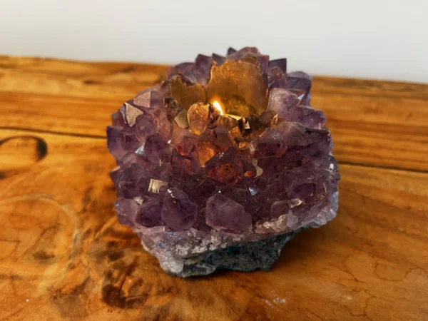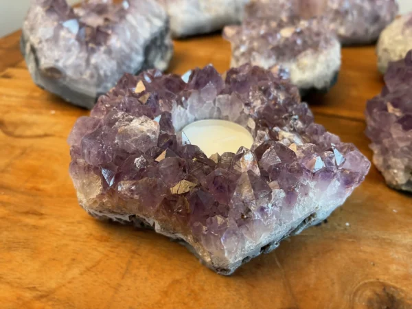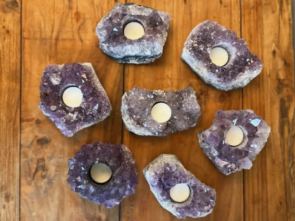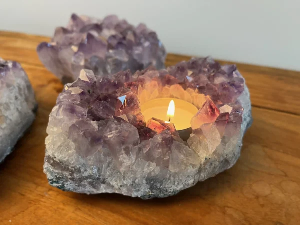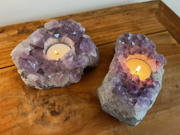Deze theelichten zijn gemaakt van echte Braziliaanse amethistclusters, bekend om hun paarse kleur en schitterende kristalstructuur. In het hart van de steen bevindt zich een uitsparing voor een waxinelichtje. Zodra je het kaarsje aansteekt, ontstaat er een prachtig effect: