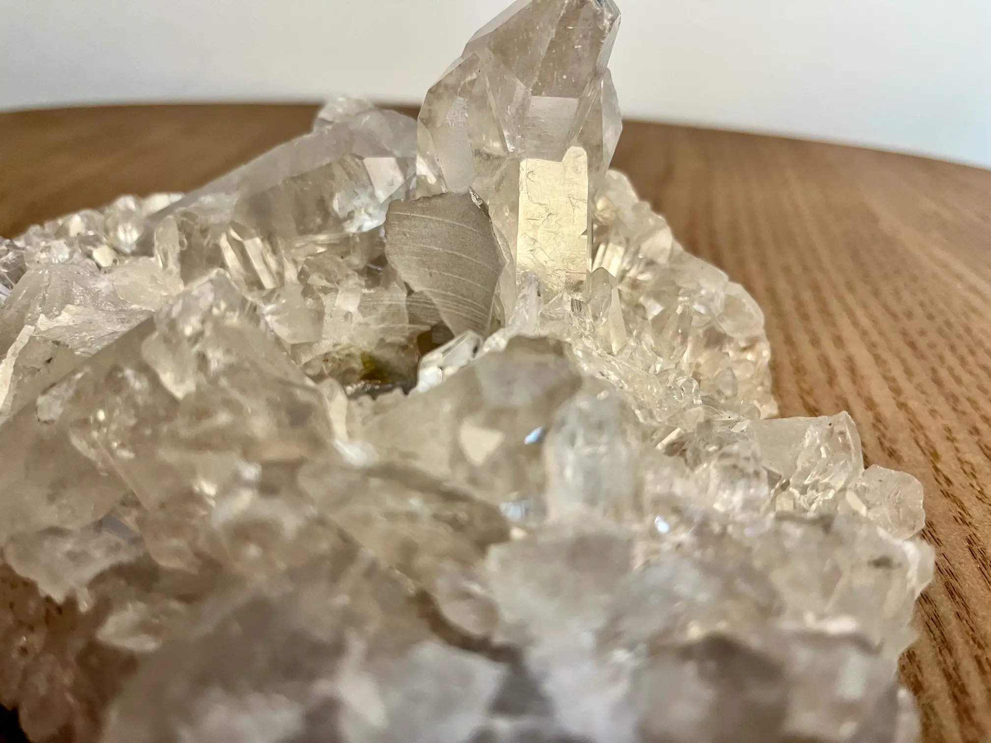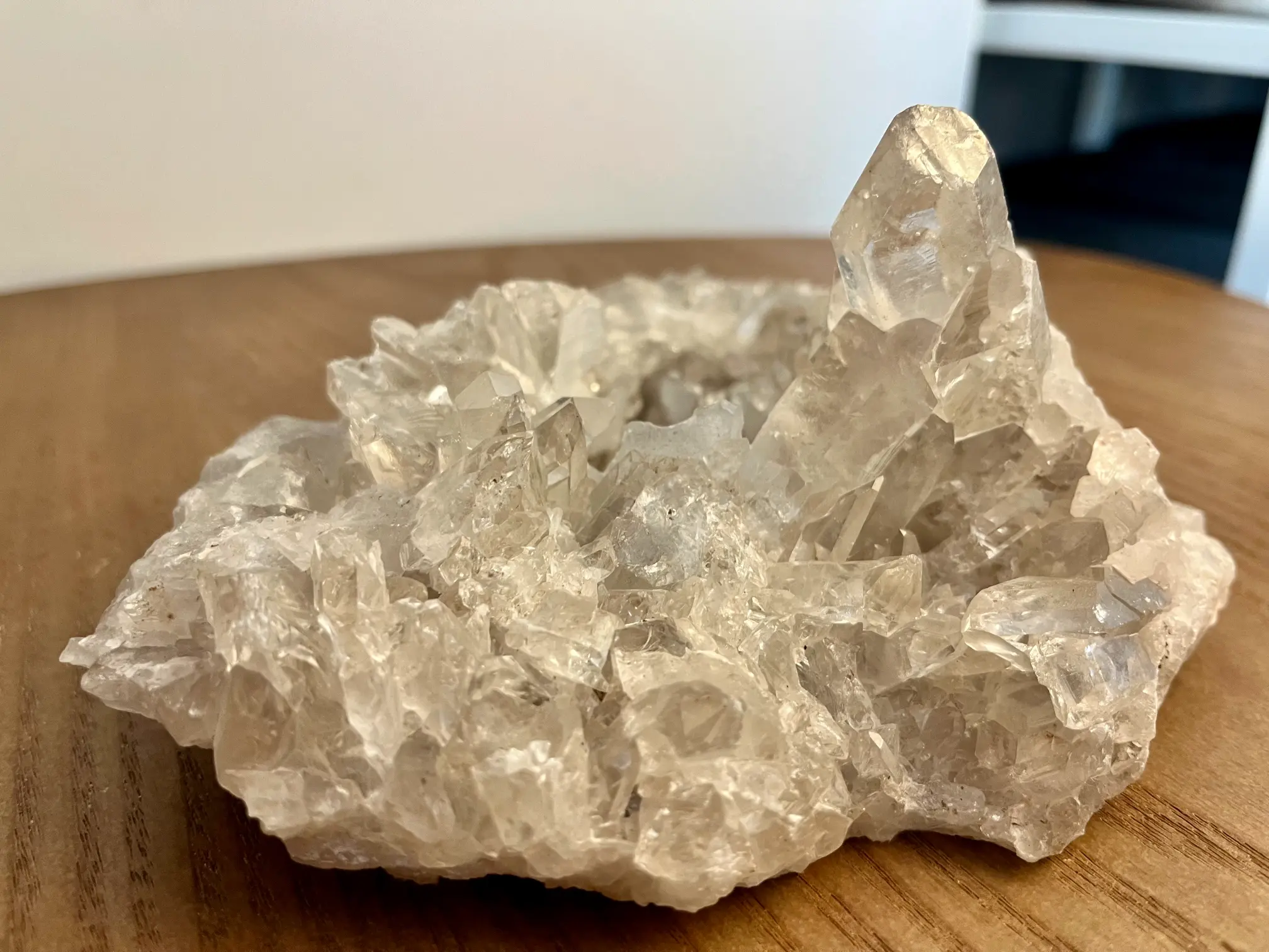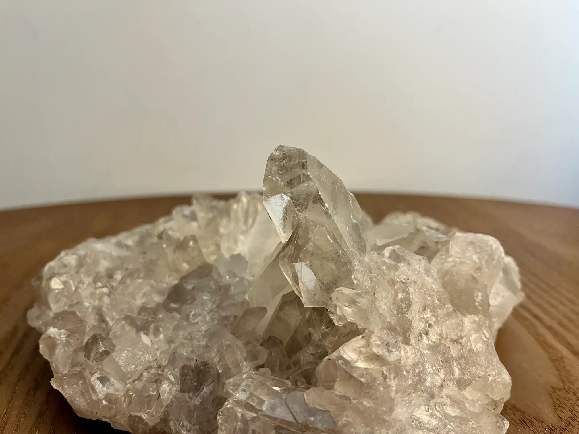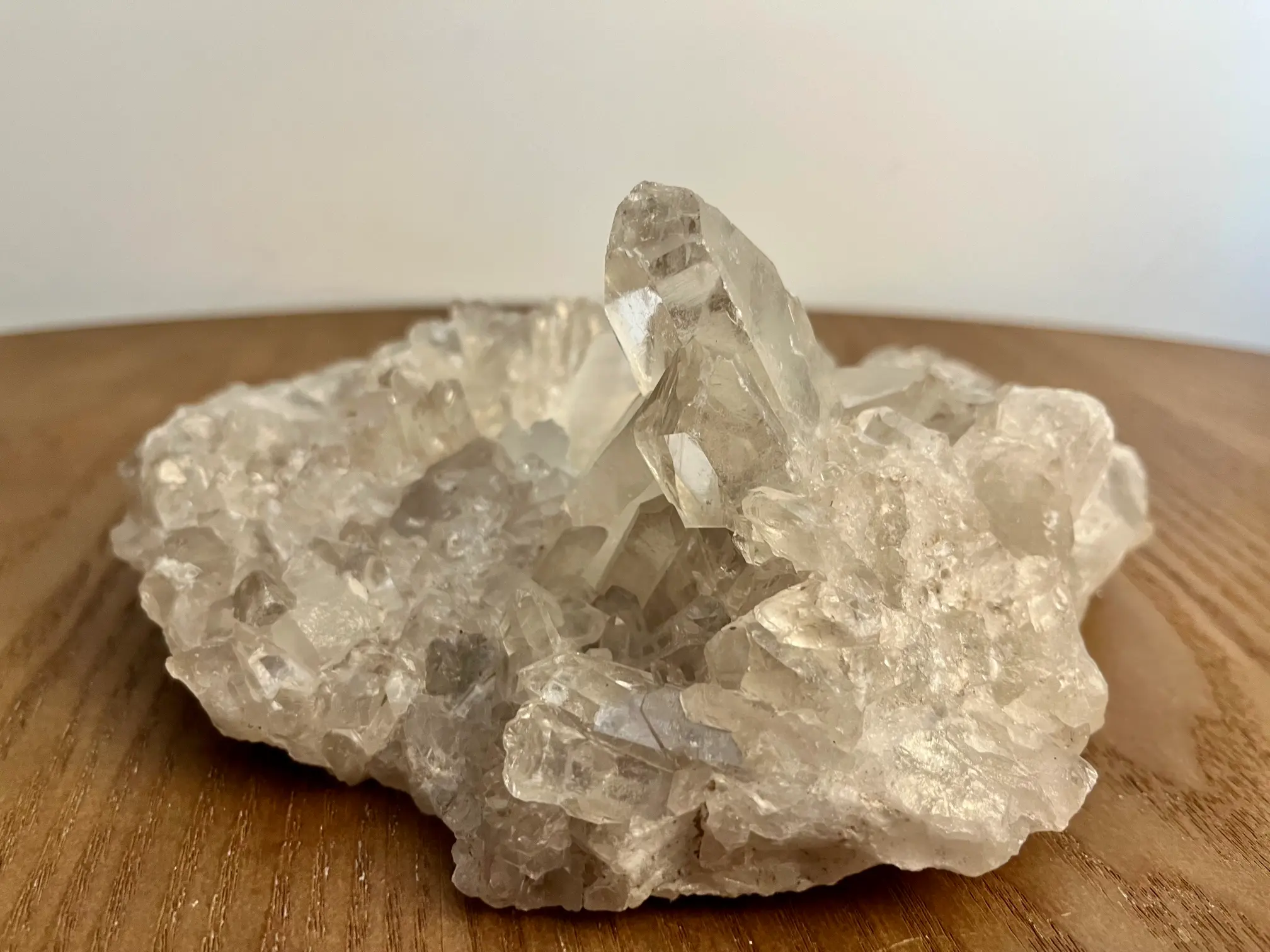 De bergkristal voor dit stuk komt uit Brazilië en is volledig in zijn natuurlijke vorm gelaten. Dat maakt elk exemplaar uniek en puur. Met een gewicht van 1249 gram en een formaat van ongeveer 18 x 15 cm.