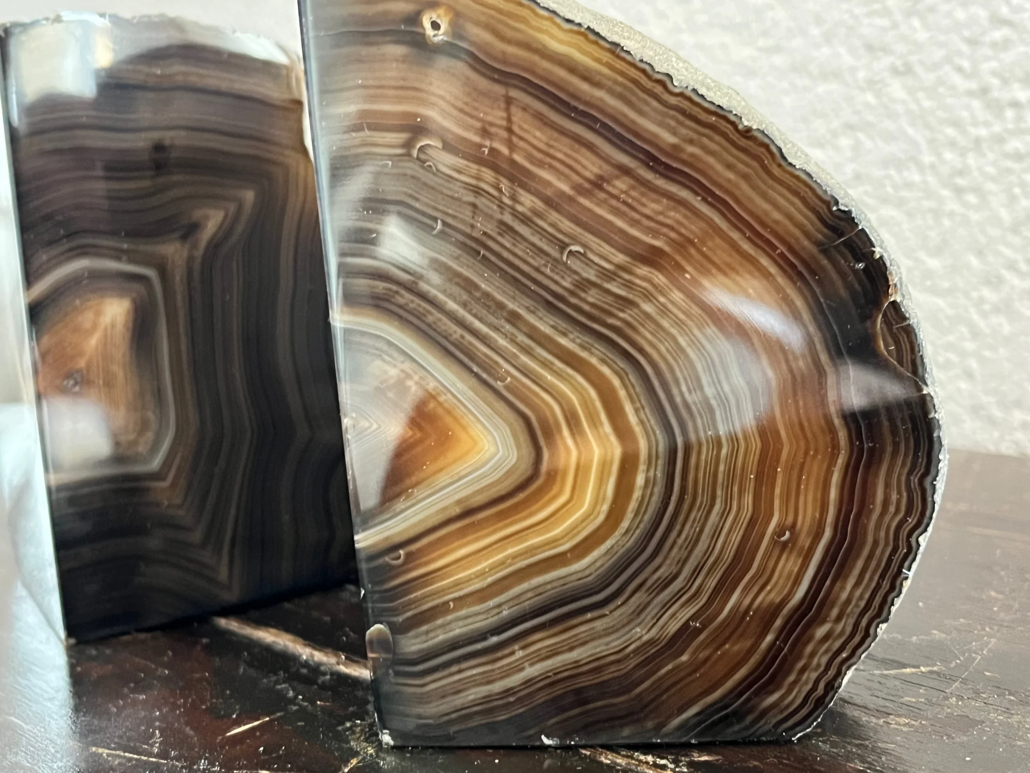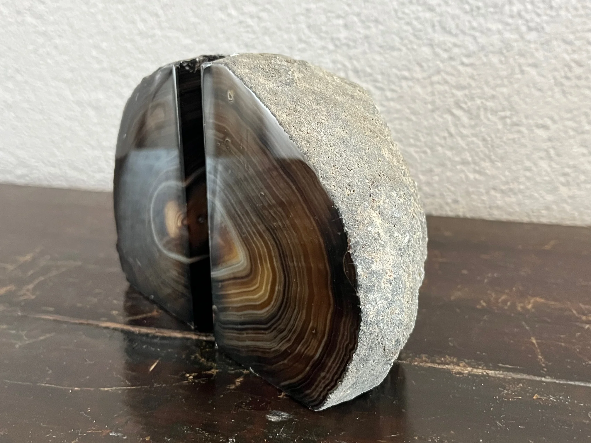 Stijlvolle boekensteunen van bruine agaat. Gepolijst aan de voorkant, ruw aan de zijkanten – een harmonie van natuurlijke kracht en warme elegantie.