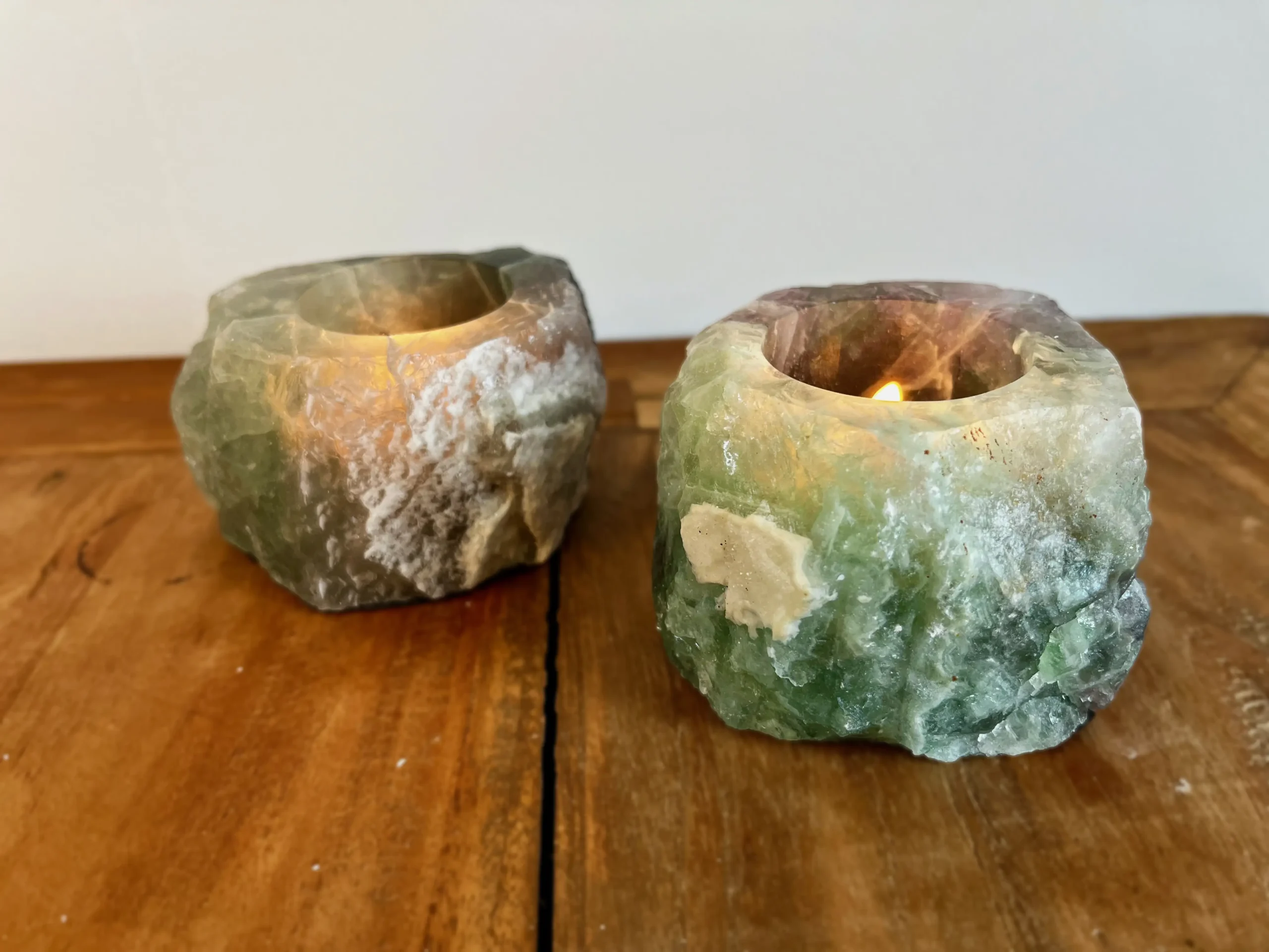 Een betoverend theelicht van ruwe Fluoriet in groen- en paarsnuances. Elk theelicht is uniek een natuurlijke bron van rust, focus en harmonieuze energie.