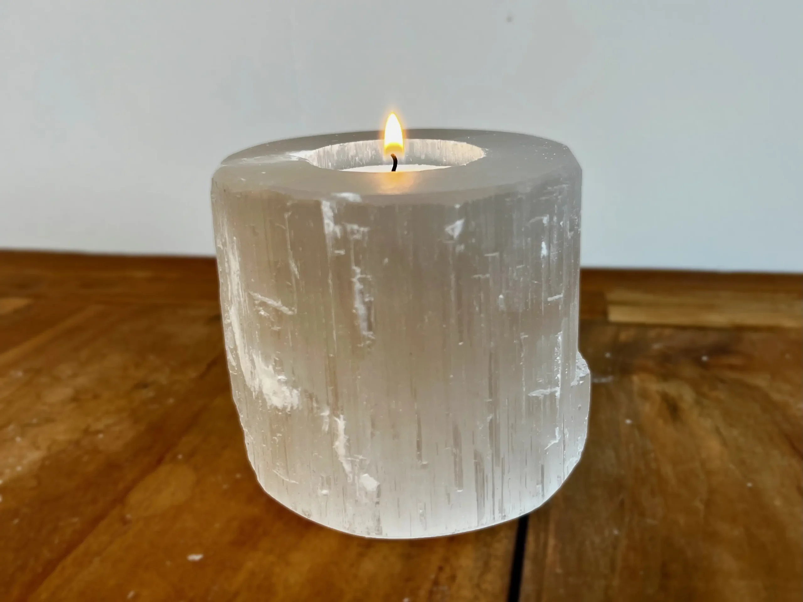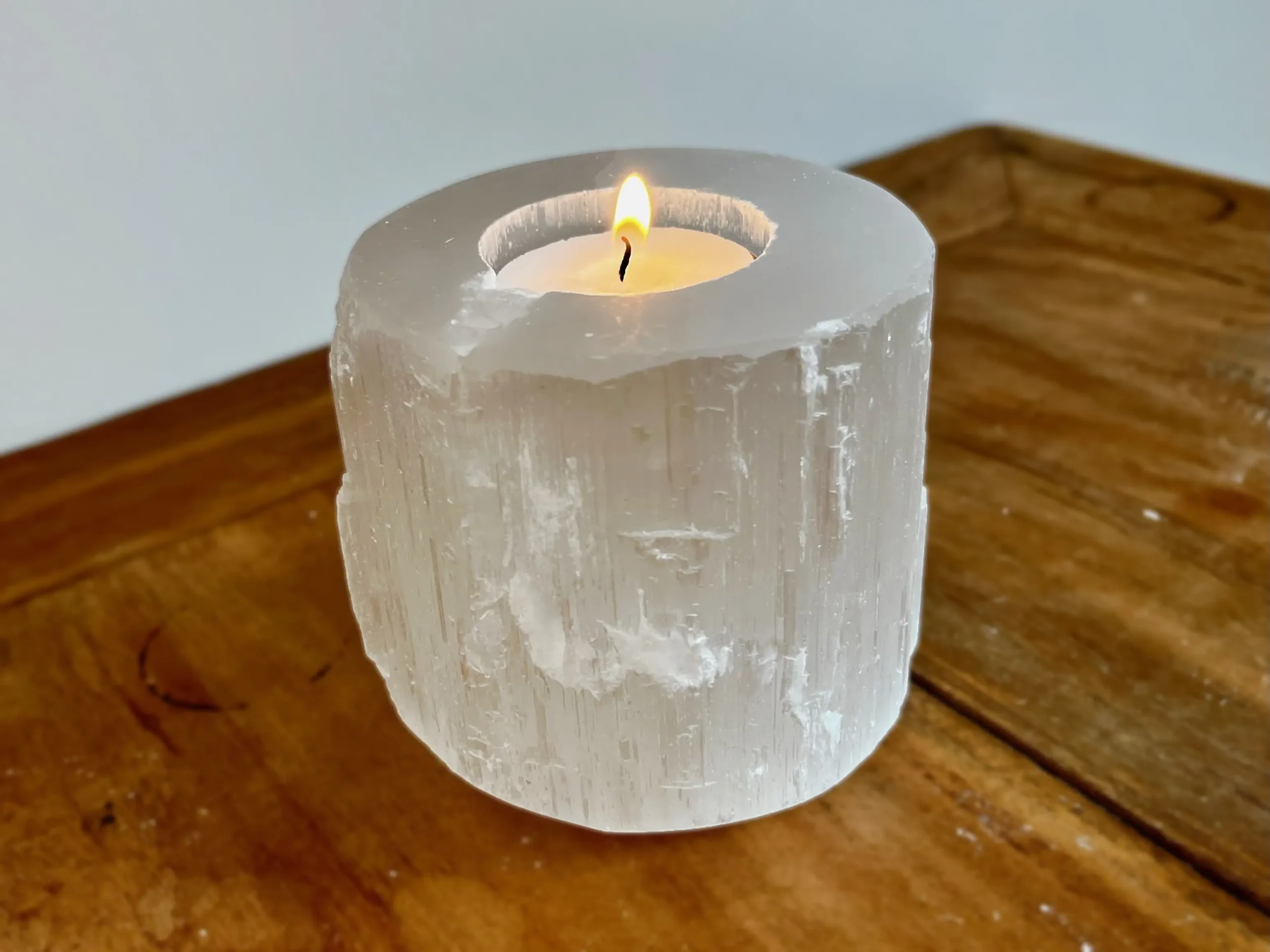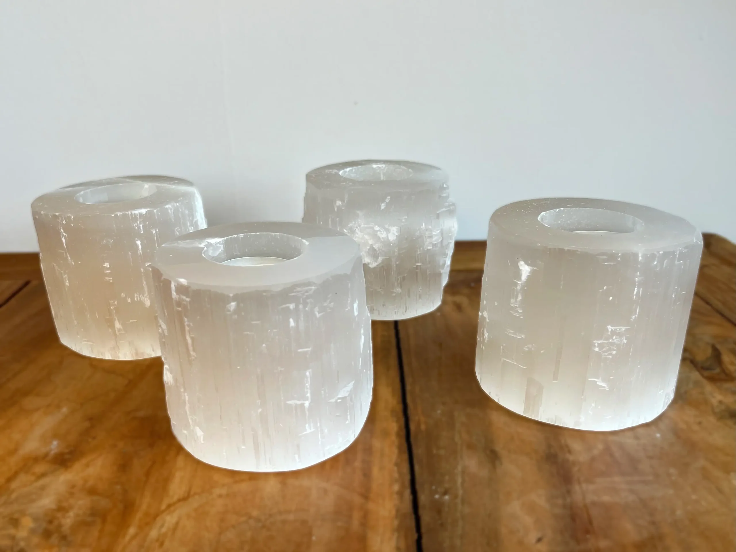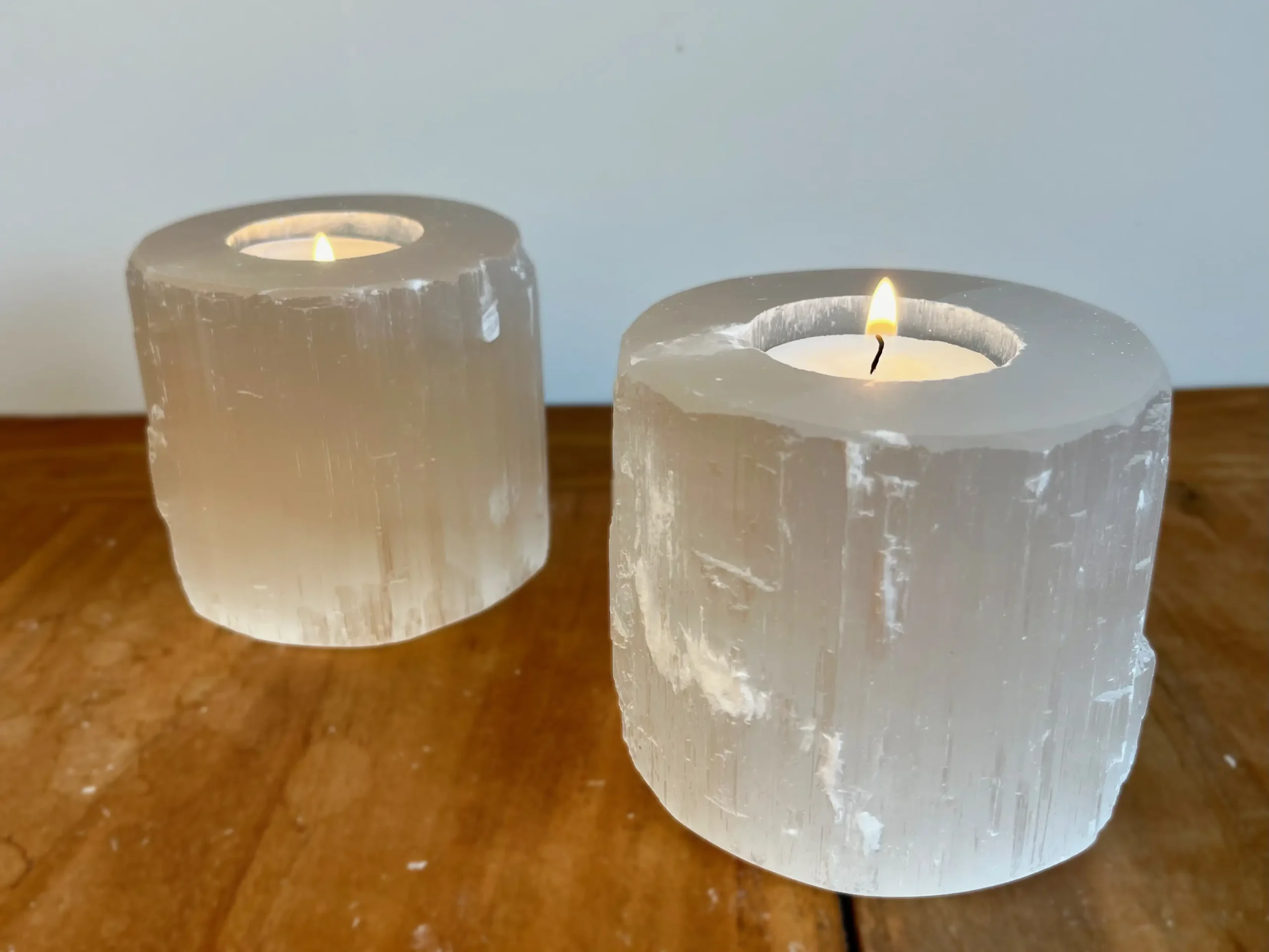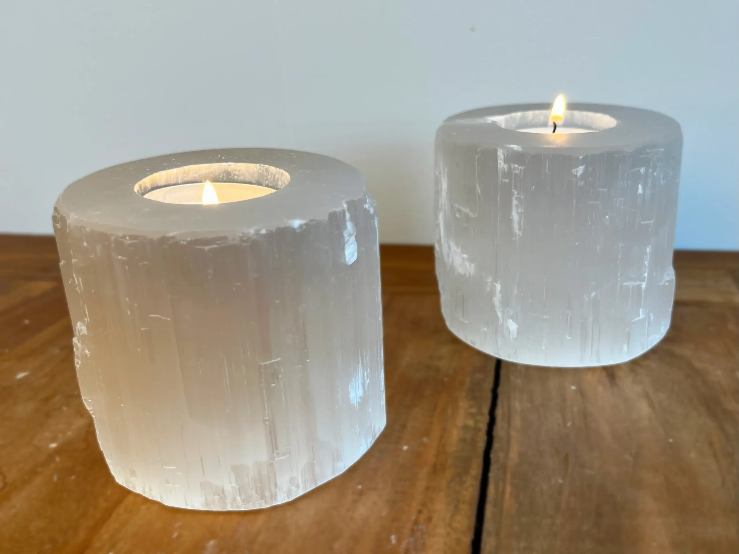 Een betoverend seleniet theelicht met een natuurlijke, robuuste afwerking. Het verspreidt zacht, engelachtig licht en brengt rust en zuiverheid in elke ruimte.