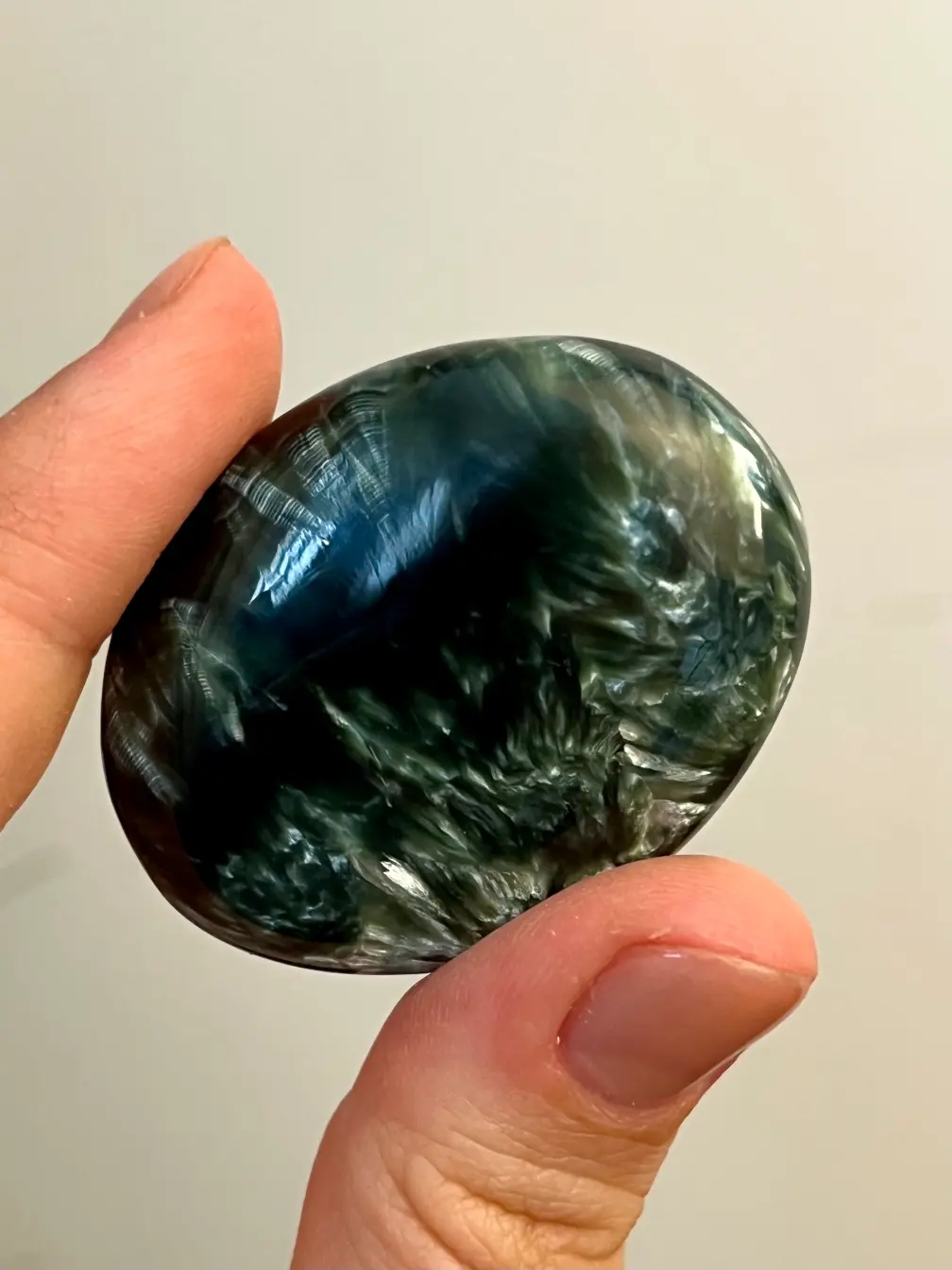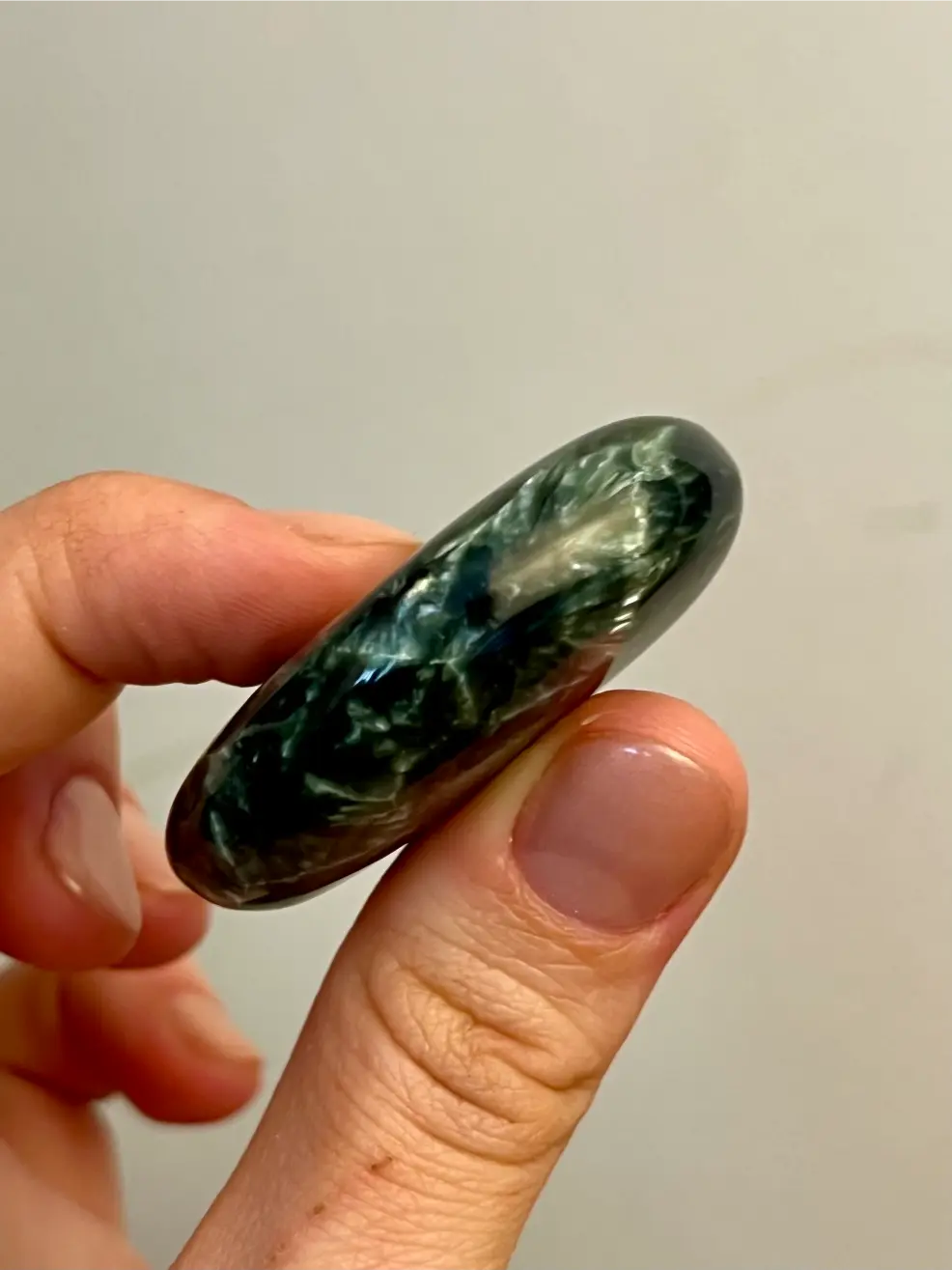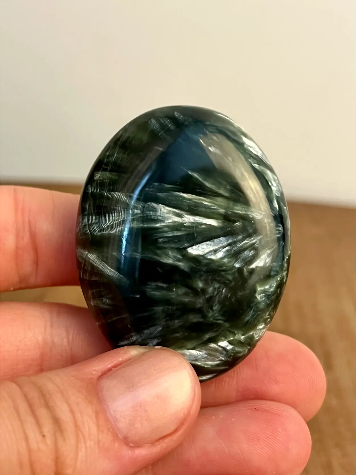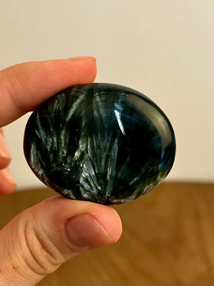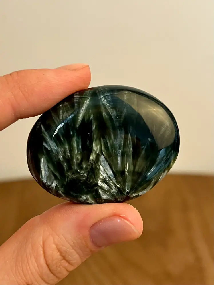 Deze serafiniet zaksteen is werkelijk bijzonder. Met zijn diepe donkergroene kleur en fijne, zilverachtige glinsterpatronen lijkt het alsof er kleine veertjes van licht door de steen lopen. Een zeldzame verschijning die je niet vaak tegenkomt en juist daarom zo geliefd is.